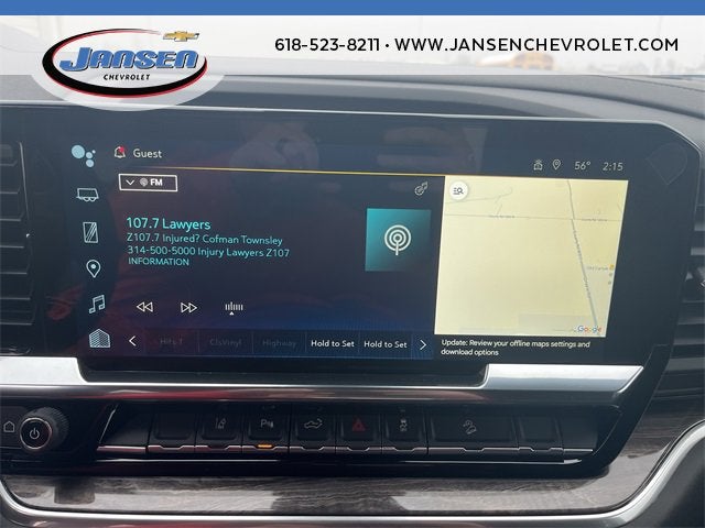 The Jansen Advantage: Complimentary Carfax on all vehicles, Complimentary Service Loaners, Complimentary Oil Change, Service Rewards Program, and Complimentary Local Pickup and Delivery. 6.6L V8 4WD Radiant Red Tintcoat 120-Volt Bed Mounted Power Outlet, 120-Volt Interior Power Outlet, 15 Diagonal Multicolor Head-Up Display, 170 Amp Alternator, 2 Charge/Data USB Ports Inside Center Console, 3.73 Rear Axle Ratio, 4-Wheel Disc Brakes, 6 Speakers, 6-Speaker Audio System, 6 Rectangular Chromed Tubular Assist Steps, 720 Cold-Cranking Amps Heavy-Duty Battery, ABS brakes, Adaptive Cruise Control, Air Conditioning, Alloy wheels, AM/FM radio: SiriusXM with 360L, Apple CarPlay/Android Auto, Auto High-beam Headlights, Auto-dimming door mirrors, Auto-Dimming Inside Rear-View Mirror, Auto-dimming Rear-View mirror, Automatic temperature control, Bluetooth® For Phone, BOSE Premium 7-Speaker Sound System, Brake assist, Bumpers: chrome, Chevrolet Connected Access Capable, Chrome Door Handles, Chrome Mirror Caps, Color-Keyed Carpeting Floor Covering, Compass, Cruise Control, Deep-Tinted Glass, Delay-off headlights, Driver door bin, Driver Memory, Driver vanity mirror, Dual front impact airbags, Dual front side impact airbags, Durabed Pickup Bed, Electric Rear-Window Defogger, Electronic Stability Control, Emergency communication system: OnStar, Floor-Mounted Center Console, Front anti-roll bar, Front Bucket Seats, Front Center Armrest w/Storage, Front dual zone A/C, Front fog lights, Front LED Fog Lamps, Front Rain-Sensing Wipers, Front reading lights, Front Rubberized Vinyl Floor Mats, Front wheel independent suspension, Fully automatic headlights, HD Rear Vision Camera, HD Surround Vision, Heated 2nd Row Outboard Seats, Heated door mirrors, Heated front seats, Heated Steering Wheel, Heated steering wheel, Hill Descent Control, Illuminated entry, LED Cargo Area Lighting, LED Smoked Amber Roof Marker Lamps, Low tire pressure warning, LTZ Convenience Package, LTZ Convenience Package II, LTZ Premium Package, Memory seat, Occupant sensing airbag, Off-Road Suspension, OnStar Services Capable, Outside temperature display, Overhead airbag, Overhead console, Panic alarm, Passenger door bin, Passenger vanity mirror, Power Door Locks, Power door mirrors, Power driver seat, Power passenger seat, Power steering, Power Sunroof, Power windows, Premium audio system: Chevrolet Infotainment 3 Premium, Push Button Start, Radio: Chevrolet Infotainment 3 Premium System, Rain sensing wipers, Rear Camera Mirror, Rear Cross Traffic Alert, Rear reading lights, Rear Rubberized Vinyl Floor Mats, Rear seat center armrest, Rear step bumper, Rear Wheelhouse Liners, Rear window defroster, Remote keyless entry, Remote Vehicle Starter System, Safety Alert Seat, Safety Package, Security system, Speed-sensing steering, Split folding rear seat, Standard Tailgate, Steering Wheel Audio Controls, Steering wheel mounted audio controls, Suspension Package, Tachometer, Technology Package, Telescoping steering wheel, Tilt steering wheel, Traction control, Trailer Camera Provisions, Trailer Side Blind Zone Alert, Trip computer, Turn signal indicator mirrors, Unauthorized Entry Theft-Deterrent System, Universal Home Remote, Variably intermittent wipers, Voltmeter, Wi-Fi Hotspot Capable, Wireless Charging, Wireless Phone Projection, Wrapped Steering Wheel, Z71 Off-Road Package.