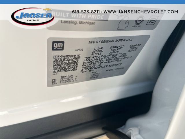 The Jansen Advantage: Complimentary Carfax on all vehicles, Complimentary Service Loaners, Complimentary Oil Change, Service Rewards Program, and Complimentary Local Pickup and Delivery. 2.5L DOHC FWD Summit White 3rd row seats: split-bench, 4-Way Manual Front Passenger Seat Adjuster, 4-Wheel Disc Brakes, 6 Speakers, 6-Speaker Audio System Feature, 8-Way Power Driver Seat Adjuster, ABS brakes, Air Conditioning, Alloy wheels, AM/FM radio: SiriusXM with 360L, Apple CarPlay/Android Auto, Auto High-beam Headlights, Automatic temperature control, Brake assist, Bumpers: body-color, Child-Seat-Sensing Airbag, Compass, Cruise Control, Delay-off headlights, Driver Confidence Package, Driver door bin, Driver vanity mirror, Dual front impact airbags, Dual front side impact airbags, Electronic Stability Control, Emergency communication system: OnStar, Four wheel independent suspension, Front anti-roll bar, Front Bucket Seats, Front Center Armrest, Front dual zone A/C, Front reading lights, Fully automatic headlights, HD Surround Vision, Heated door mirrors, Heated Driver and Front Passenger Seats, Heated front seats, Heated steering wheel, Illuminated entry, Key Card, Low tire pressure warning, Navigation System, Occupant sensing airbag, Outside temperature display, Overhead airbag, Overhead console, Panic alarm, Passenger door bin, Passenger vanity mirror, Power door mirrors, Power driver seat, Power Liftgate, Power Outlet, Power steering, Power windows, Premium Cloth Seat Trim, Radio data system, Radio: : Audio System w/17.7 Diagonal Display, Rear air conditioning, Rear anti-roll bar, Rear Camera Mirror, Rear Pedestrian Alert, Rear reading lights, Rear window defroster, Rear window wiper, Remote keyless entry, Security system, SiriusXM with 360L Trial Subscription, Speed-sensing steering, Spoiler, Steering wheel mounted audio controls, Tachometer, Telescoping steering wheel, Tilt steering wheel, Traction control, Traffic Sign Recognition, Trip computer, Turn signal indicator mirrors, Variably intermittent wipers, Voltmeter, Wheels: 18 Grazen Metallic Machined-Face Aluminum. 20/26 City/Highway MPG