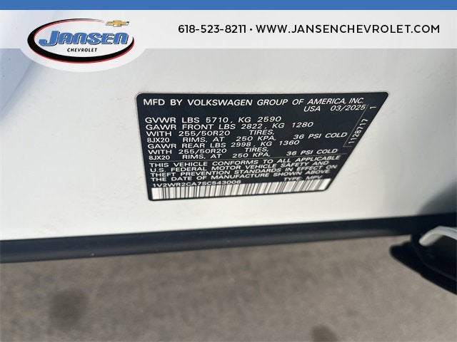 20" 2-tone machined alloy wheels, 3rd row seats: split-bench, 4-Wheel Disc Brakes, 6 Speakers, ABS brakes, Air Conditioning, Alloy wheels, AM/FM radio: SiriusXM with 360L, Auto High-beam Headlights, Auto-dimming Rear-View mirror, Automatic temperature control, Brake assist, Bumpers: body-color, Compass, Cruise Control, Delay-off headlights, Driver door bin, Driver vanity mirror, Dual front impact airbags, Dual front side impact airbags, Electronic Stability Control, Emergency communication system: VW Car-Net Safe & Secure 5-year, Exterior Parking Camera Rear, Four wheel independent suspension, four-wheel independent suspension, Front anti-roll bar, Front Bucket Seats, Front Center Armrest, Front dual zone A/C, Front fog lights, Front reading lights, Fully automatic headlights, heated and Actively ventilated front bucket seats, Heated door mirrors, Heated front seats, Heated steering wheel, Illuminated entry, Low tire pressure warning, MIB3 composition media radio, Occupant sensing airbag, Outside temperature display, Overhead airbag, Overhead console, Panic alarm, Passenger door bin, Passenger vanity mirror, perforated V-Tex leatherette seating surfaces, Power door mirrors, Power driver seat, Power Liftgate, Power steering, Power windows, Radio data system, Rain sensing wipers, Rear air conditioning, Rear anti-roll bar, Rear reading lights, Rear seat center armrest, Rear window defroster, Rear window wiper, Remote keyless entry, Security system, Speed-sensing steering, Split folding rear seat, Spoiler, Steering wheel mounted audio controls, Tachometer, Telescoping steering wheel, Tilt steering wheel, Traction control, Trip computer, Turn signal indicator mirrors, Variably intermittent wipers, Ventilated front seats.